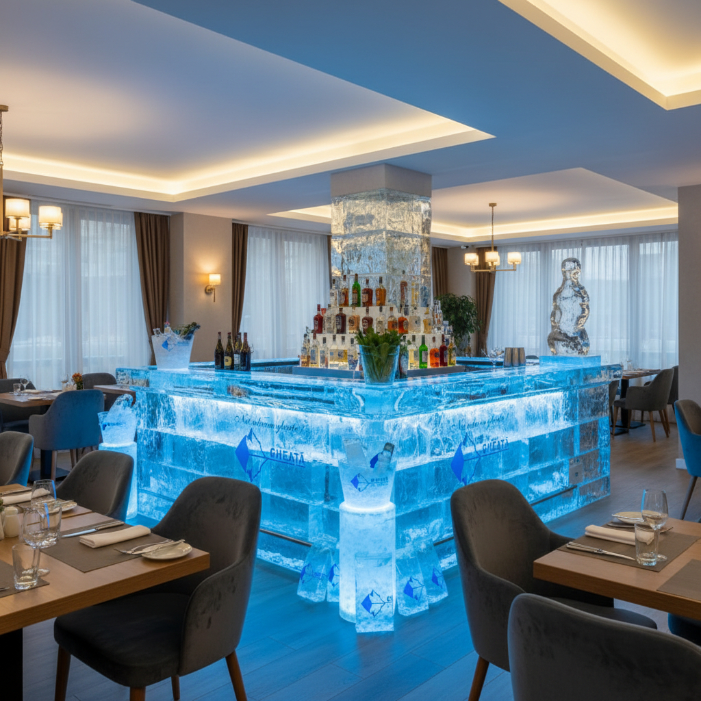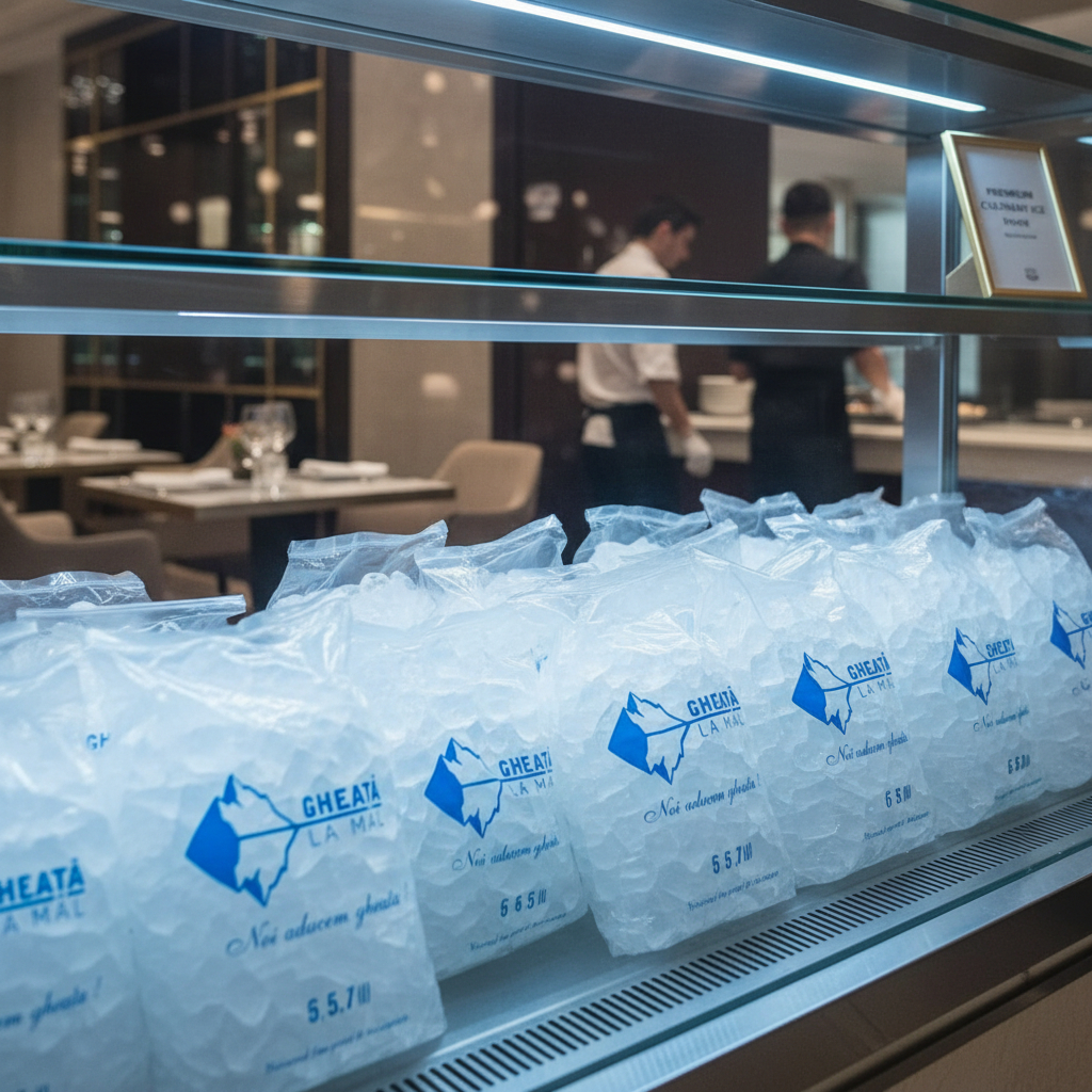 Gheață alimentară cristalină, produsă prin ozmoză inversă și tratament UV, livrată rapid în toată România. Pentru HoReCa, hoteluri și evenimente care nu își permit compromisuri.